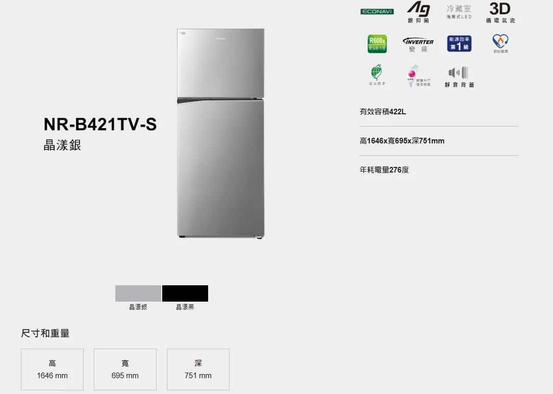 Panasonic 國際無邊框鋼板2門電冰箱 NR-B421TV