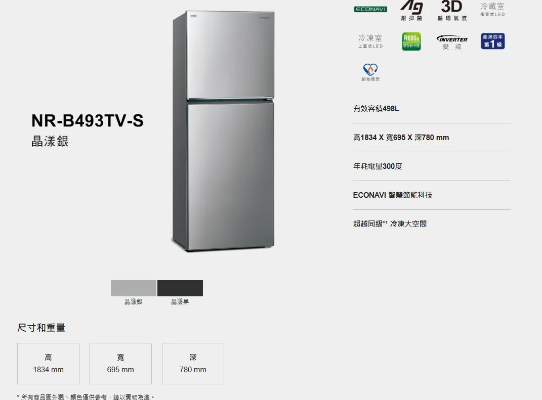 Panasonic 國際無邊框鋼板2門電冰箱 NR-B493TV